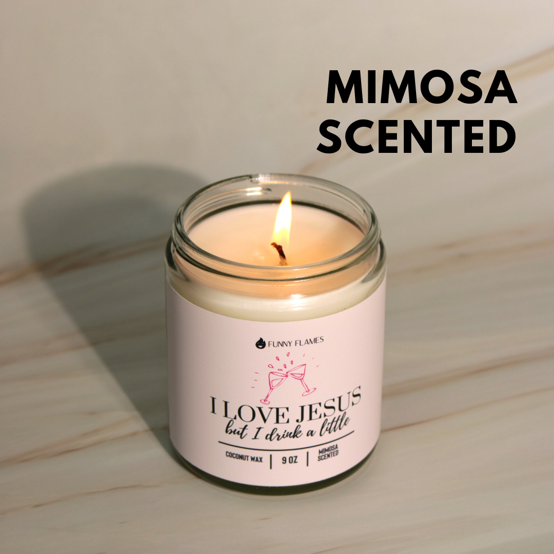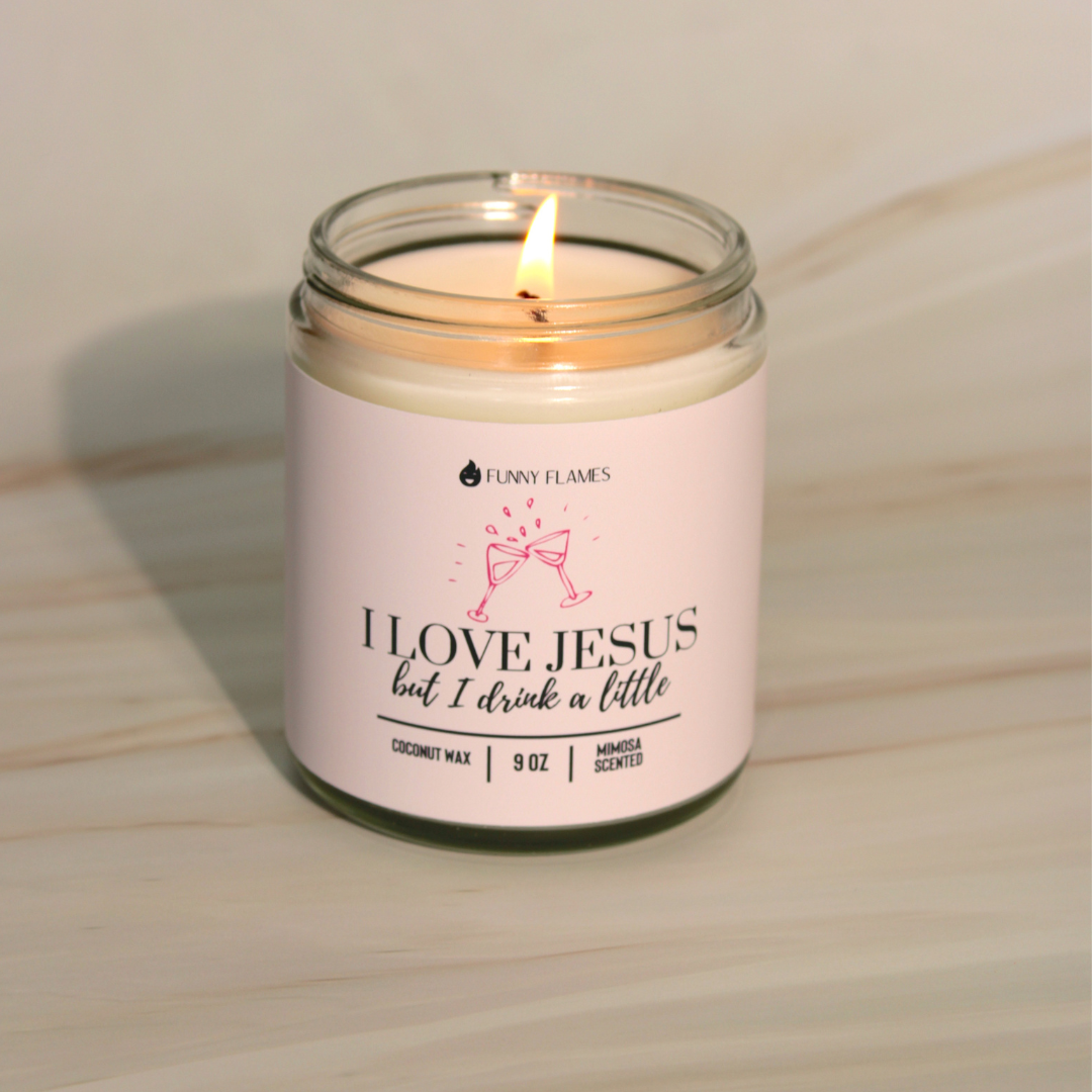 "I Love Jesus But I Drink A Little" candle, made with a coconut apricot wax blend that's as smooth as forgiveness and as fun as your wildest girls' night out. Scented with the bubbly essence of Mimosa, this candle will have you feeling like you're brunching with the heavens above!